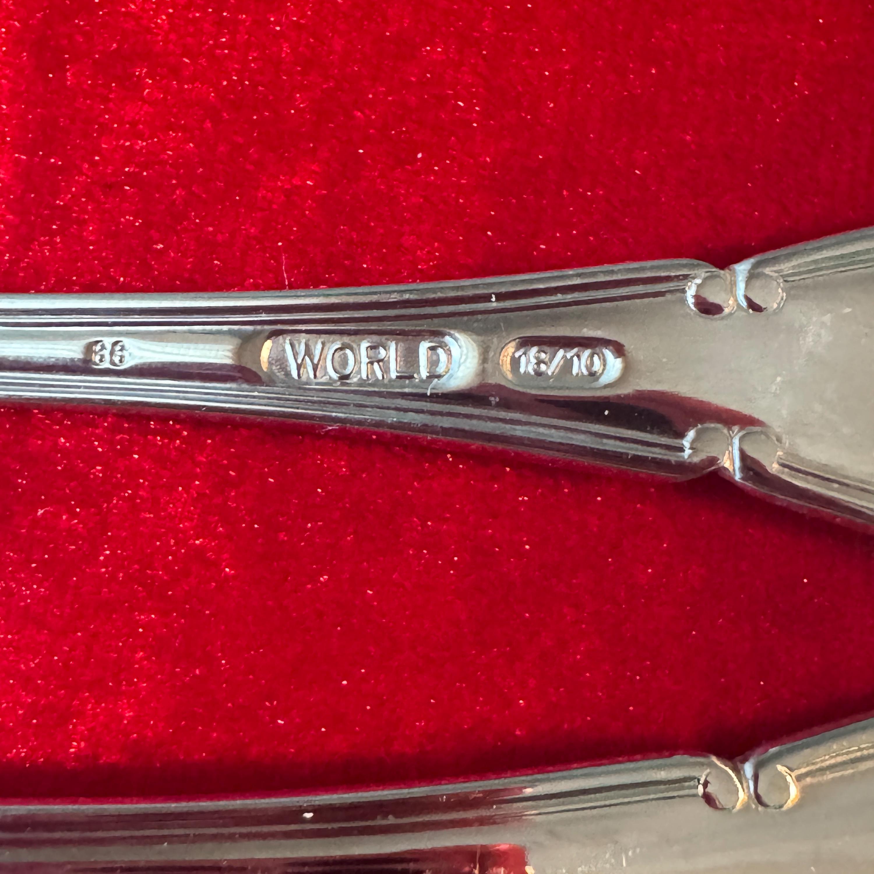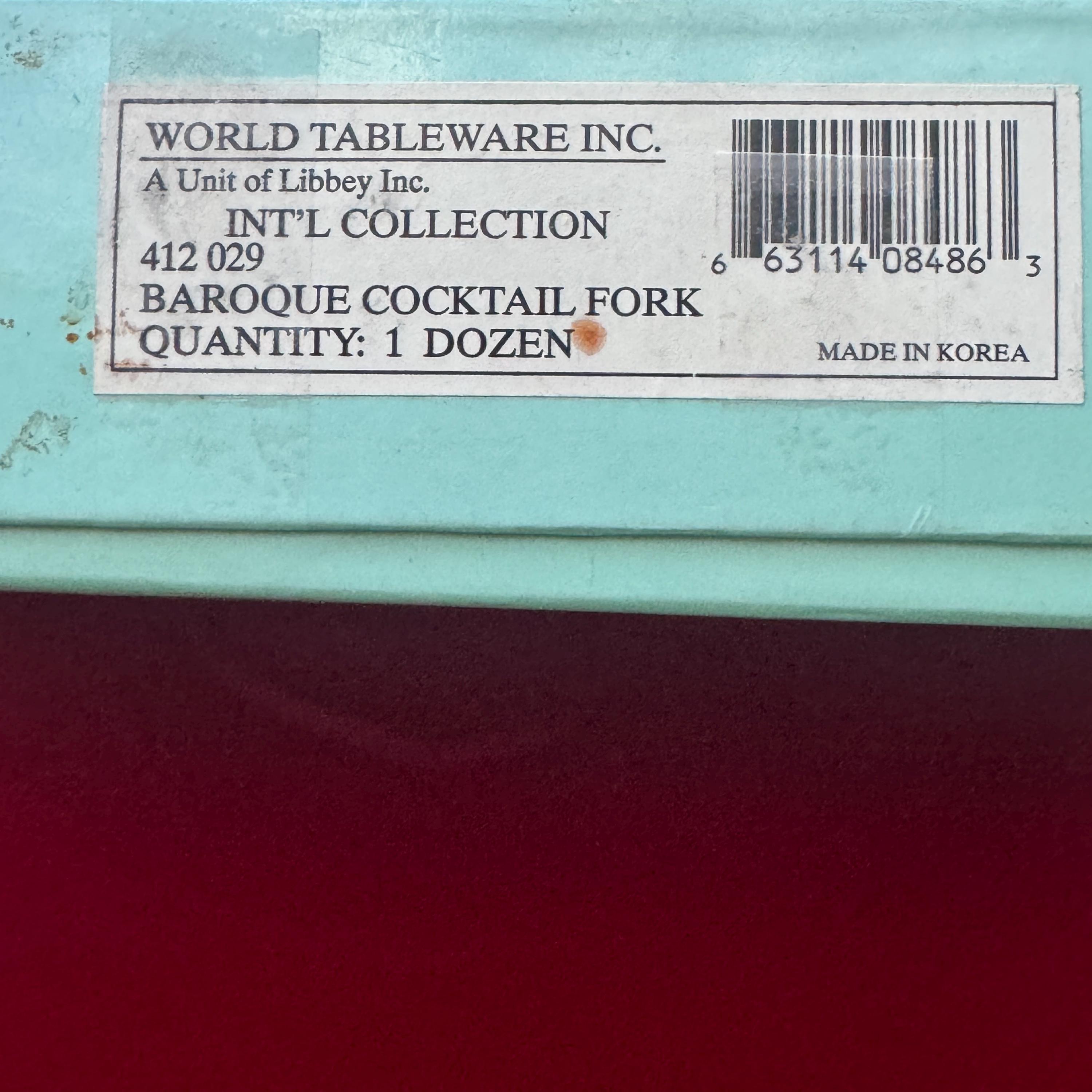 Libbey (formerly World Tableware) Baroque Pattern Cocktail Forks, model number 412 029. These forks are crafted from durable 18/10 or 18/8 stainless steel, measure 5-3/8 inches in length, and are designed for commercial or home use.